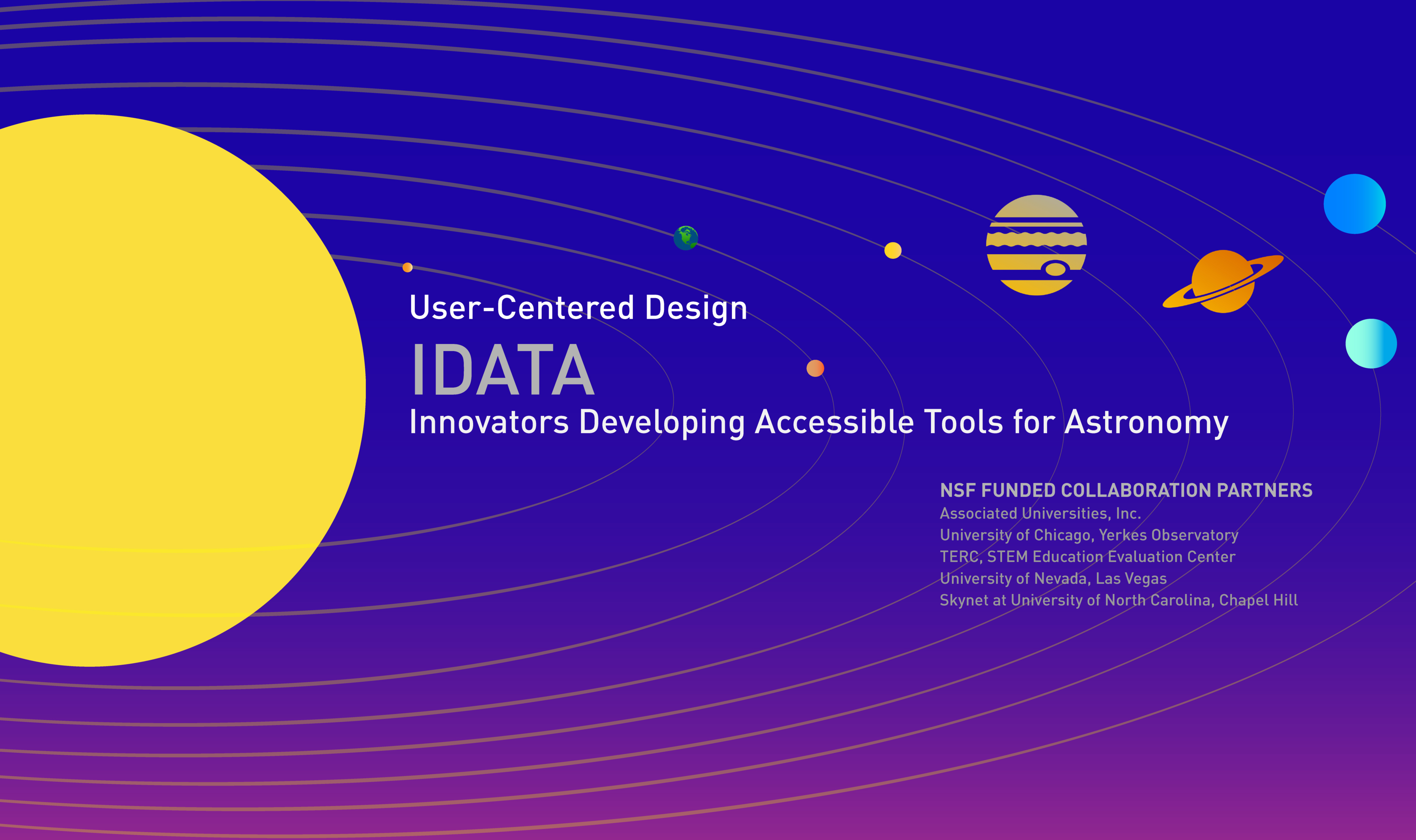 IDATA (Innovators Developing Accessible Tools for Astronomy) is a three-year Design and Development project funded by a $2.5 million National Science Foundation grant. IDATA is a collaboration between Associated Universities Inc., University of Chicago Yerkes Observatory, TERC, University of Nevada at Las Vegas and the University of North Carolina at Chapel Hill. This project engages high school students and their teachers, professional astronomers, software engineers, and design experts in the User-Centered Design process of data analysis software for astronomy.